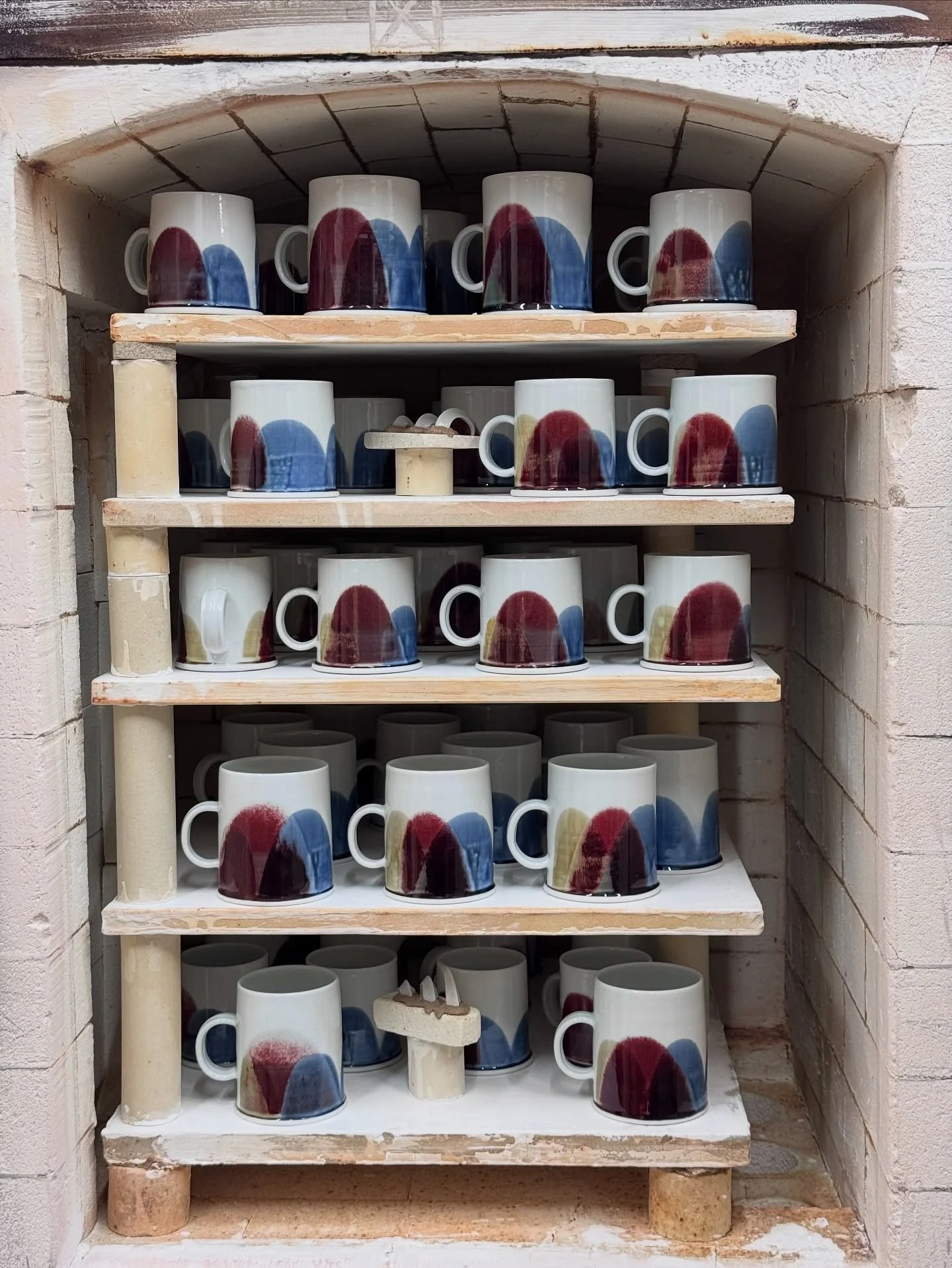 The wheel thrown pottery pieces range from cups, mugs, jugs, creamers to vases, plates and bowls. They are hand made in porcelain and decorated by hand.