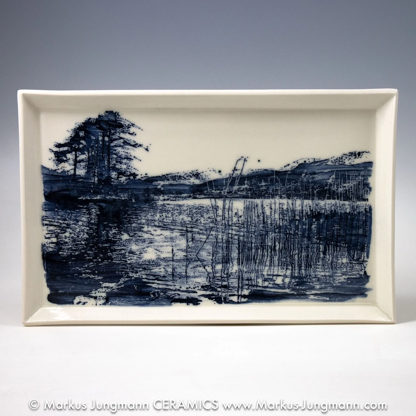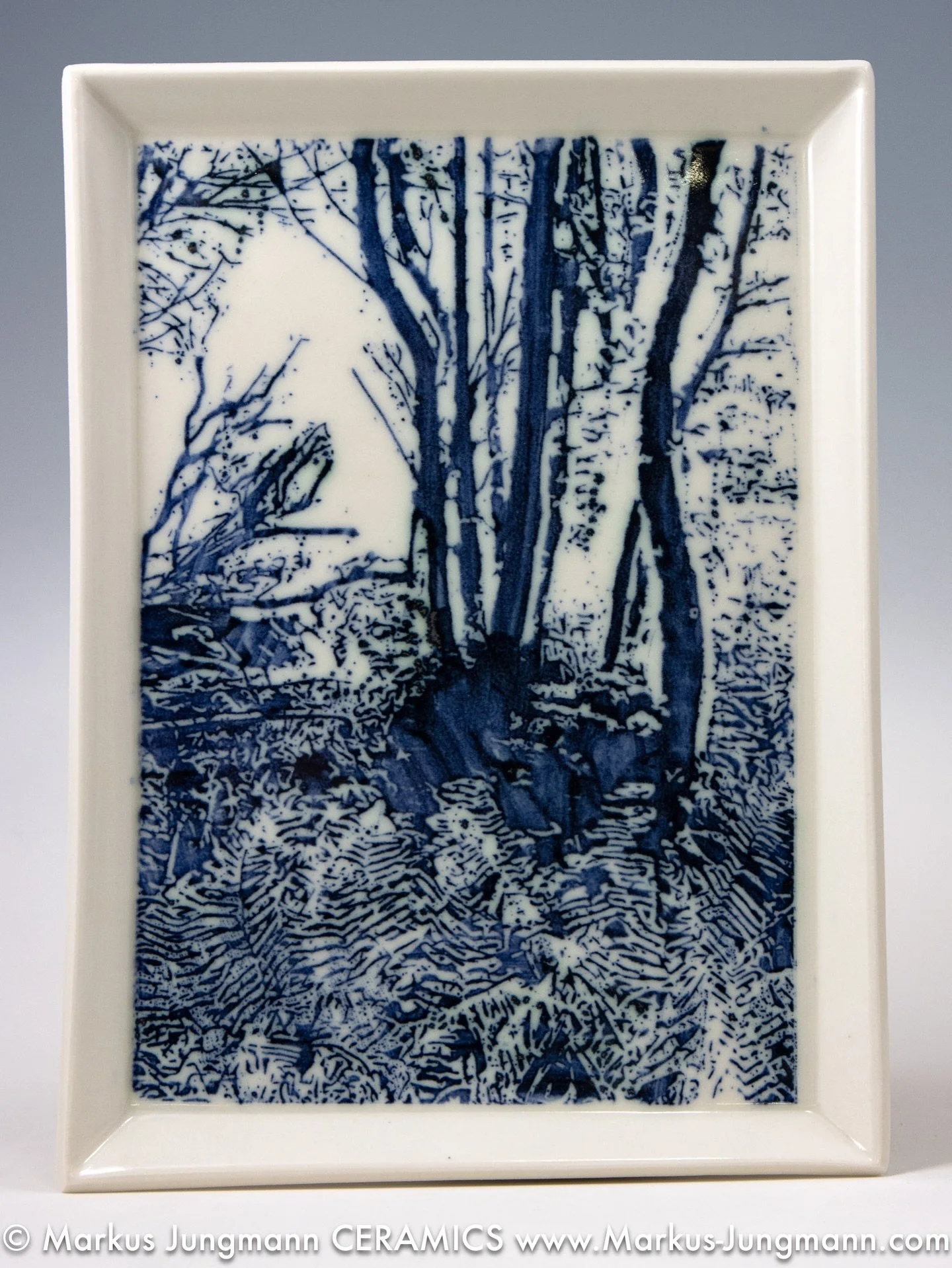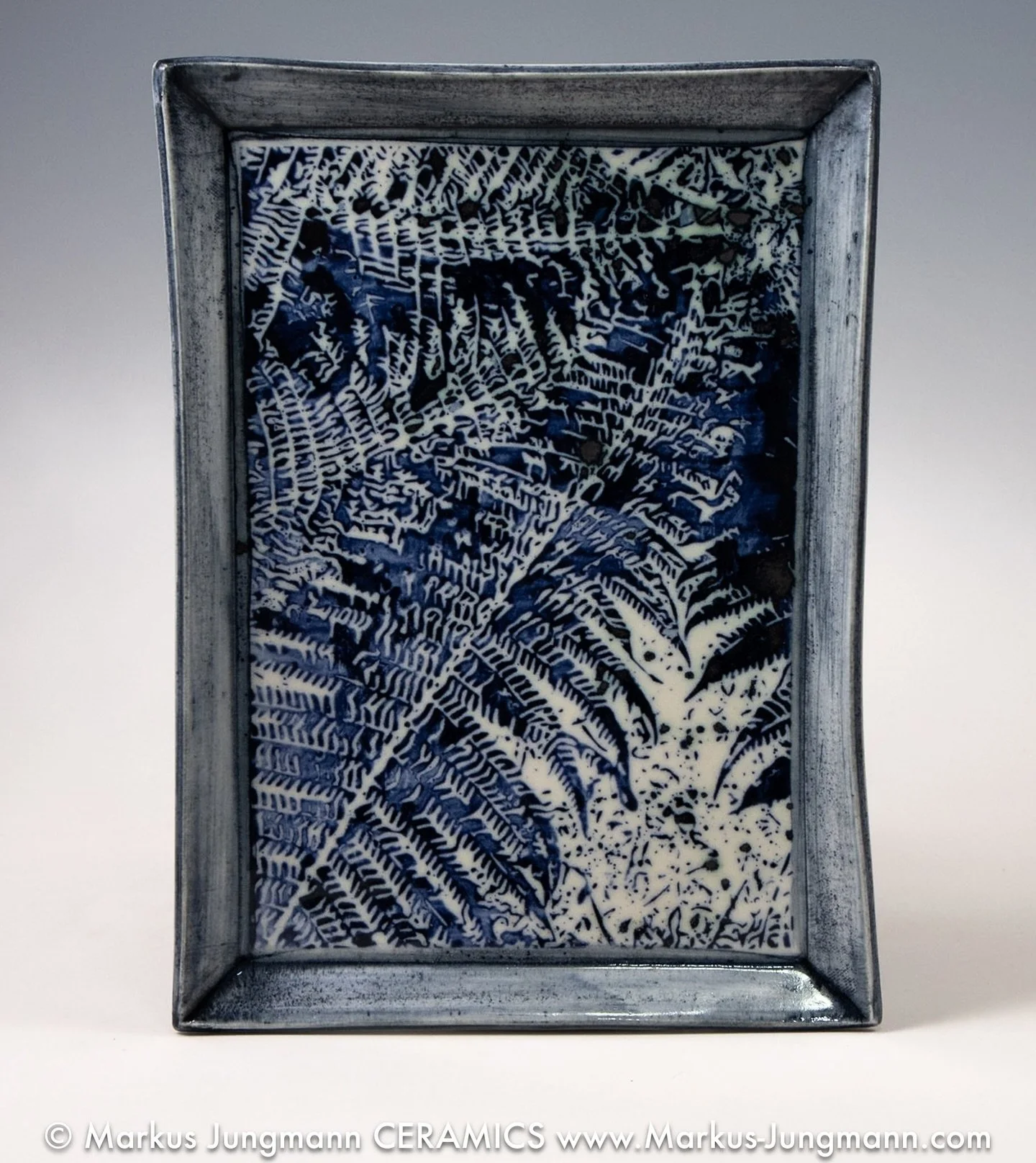 Plates and platters with Mono Prints referencing the rural Irish plant life, like his “Whitethorn Series” or ‘Whitethorn Blossom”, “Irish Oak” and “Euphorbia”.